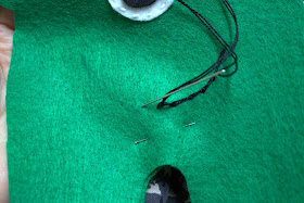 On a side note, I made the eyes by cutting out my felt shapes and gluing them with felt glue. I let the felt glue dry and I reinforced the glue with stitches. Once I had the center of the eye secured I used embroidery thread (I liked the look of big noticeable stitches) to attach the eye to the face of the monster.