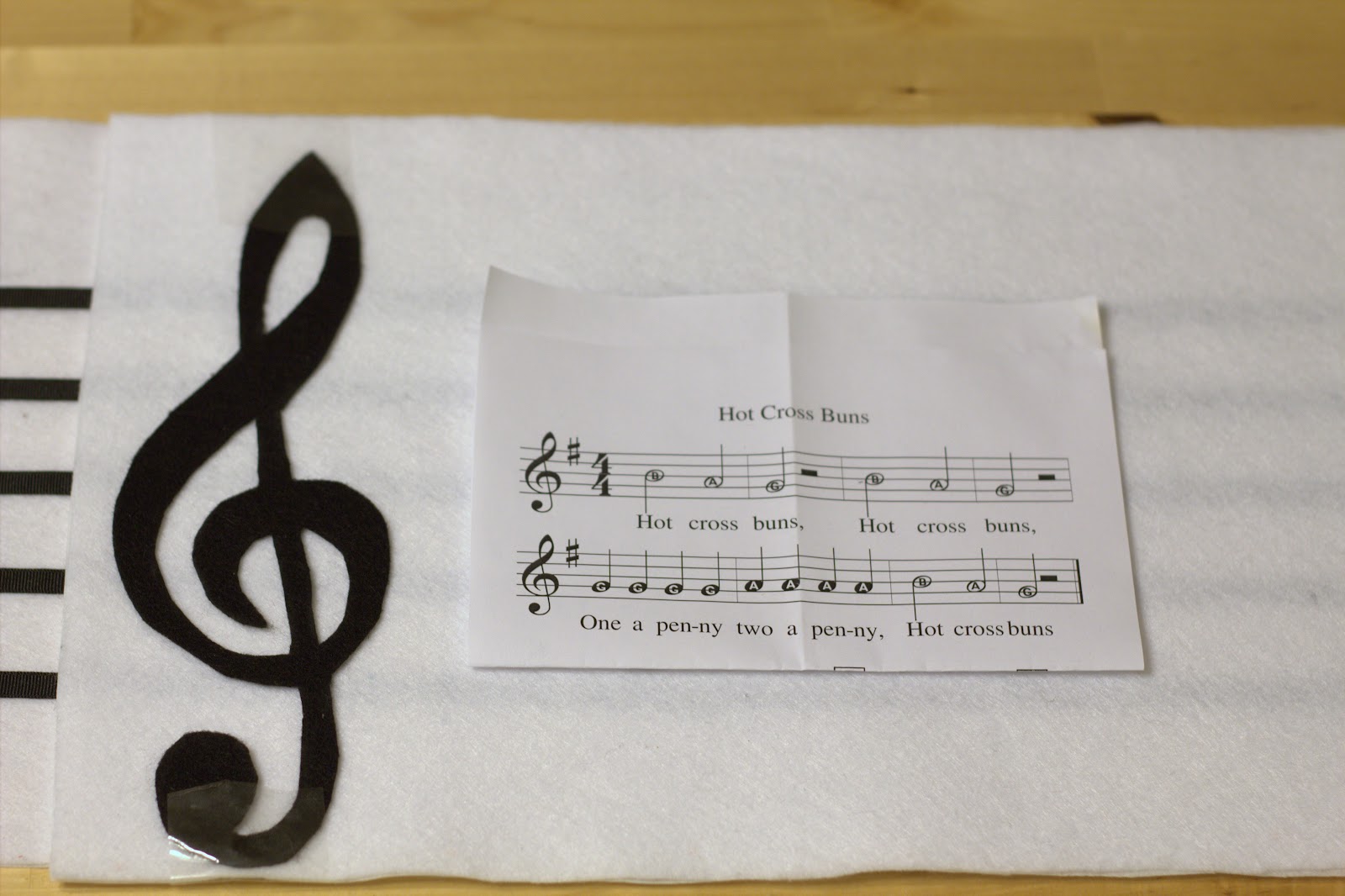 5. Start laying your lines on the white felt, making sure your music note template can fit in the spaces of the lines. Also, you want to make sure that the lines touch certain parts of the treble clef. I had to trim off some of the clef in order for the lines to be visible.